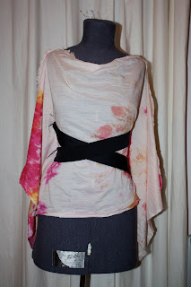 Keeping with the dying theme, this piece of fine cotton lawn got thrown under the ice dying as well but as you can see it didn't quite get very much of the dye on it so it won't be used for the collection but draping it on the model did come up with an interesting shape which i thought was good and could be used in possible the heavier dyed fabric..